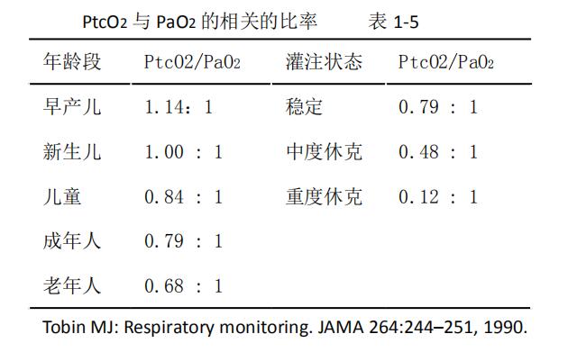 年齡也是影響經皮監測儀監測的重要因素。如果使用PtcO2∶PaO2的比率進行評價,1∶1表示兩者一致。從表1-5中可以看出,僅新生兒PtcO2∶PaO2的比率為1∶1,因此,就年齡而言,患者越小,PtcO2∶PaO2之間的一致性越好,這主要是與年齡相關的皮膚組成差異。對嬰兒的研究中得出,PtcO2值趨于動脈值,但具有較大的負偏差。